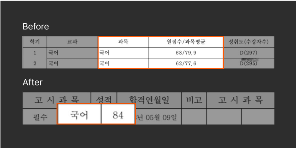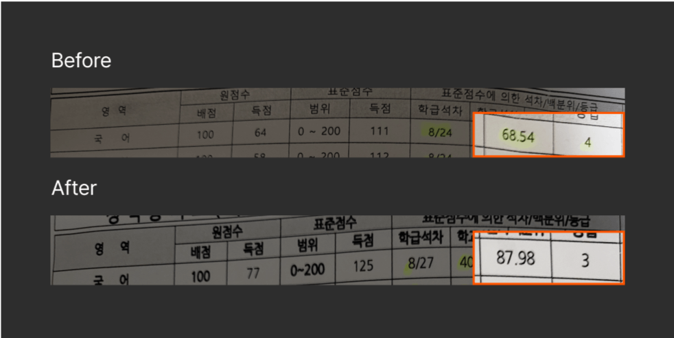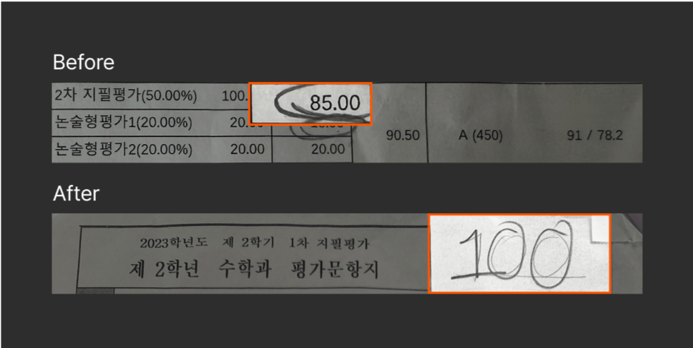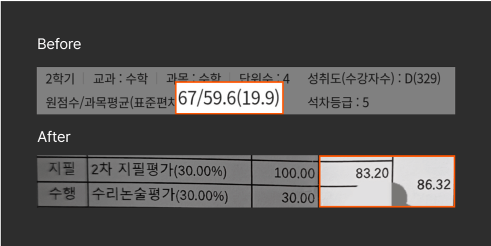 영어가 6등급에 가까운 5등급이었는데, 3등급에 가까운 4등급으로 올랐고 수학은 7등급에 가까운 6등급이었는데 4등급에 가까운 5등급이 되었어요! 저에게 맞춰 선생님이 매칭되고 커리큘럼도 저에게 맞춰서 따라가기 편했어요!